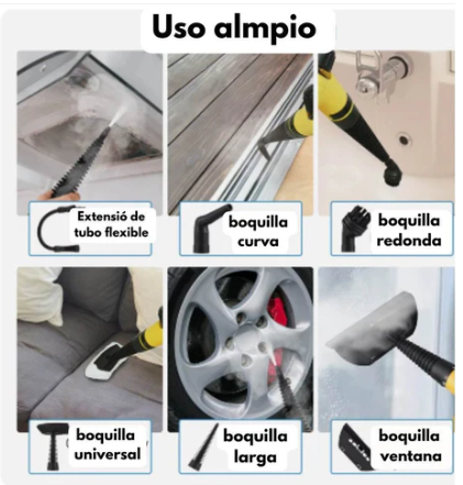 Incluye accesorios para cocina, baño, vidrios, tapicería y rincones difíciles